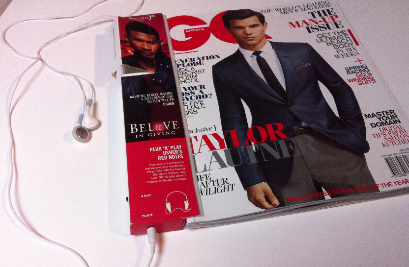 Sure, it’s not an exceptionally exciting MP3 player – according to Mumbrella, once the spine has been switched on, the mag will play a dance track, followed by a message from R&B-person Usher (why would you name yourself after an almost obsolete customer service job?) promoting Belvedere vodka’s involvement with the RED campaign to wipe out HIV in Africa.
