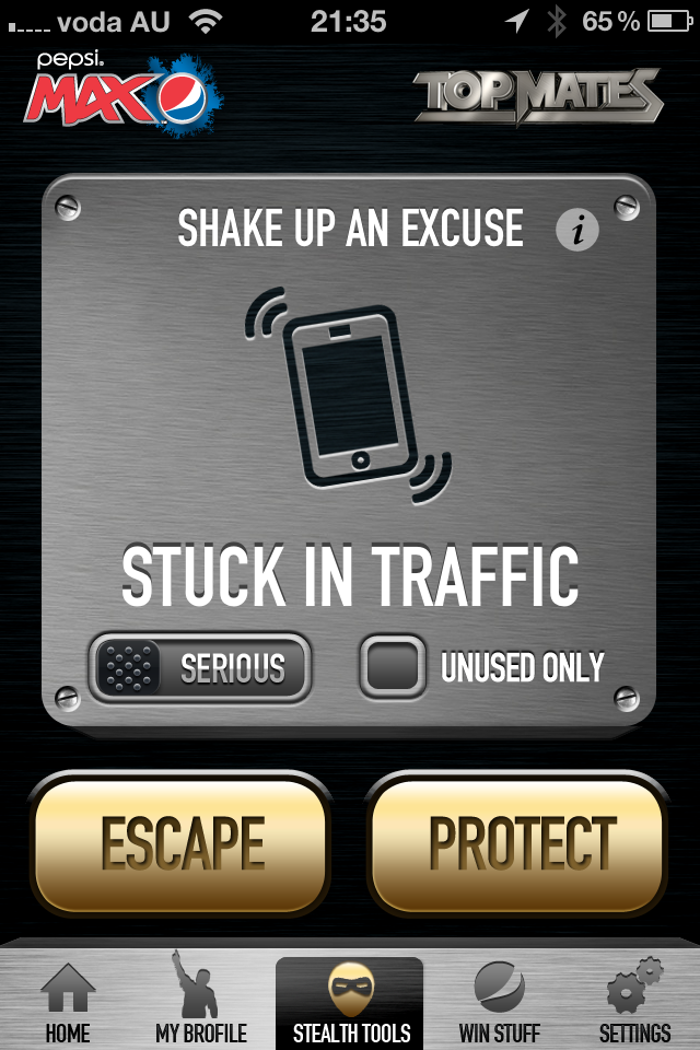 Pepsi Max have an app called Top Mates – yeah, it’s a bit cornyand overly Aussie – but outside of that, just a quick download and tap of the “Stealth Tools” icon and you’ll be presented with a quick excuse like “Can’t get a cab”. Of course, you don’t need an excuse for the situation you’ve just gotten into, and you’re a bigger man than that anyway – but it’s always handy. Shake the phone again and get a new one – “Stuck in an elevator”