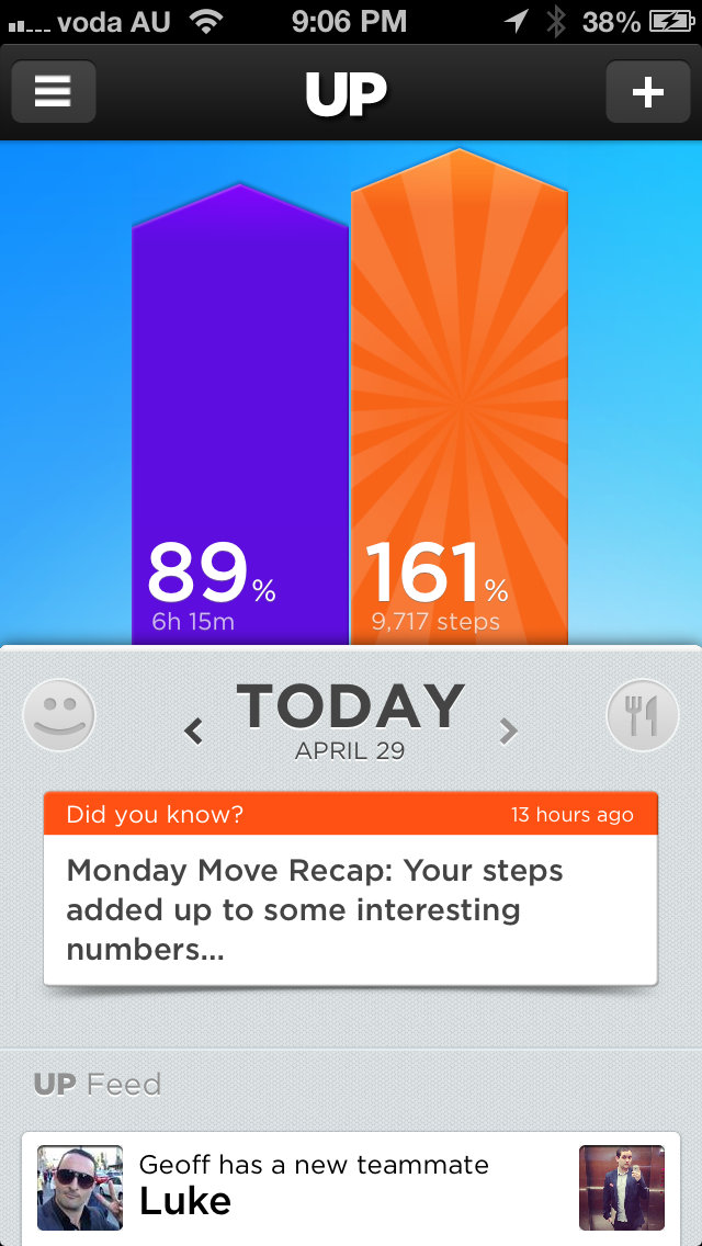 Lets look first at the data the armband can’t detect.  What you eat and how you’re feeling.  In the Up app you can enter your food and drink consumption manually by searching for the item and adding it to your daily dietary intake.  This allows you to track calorie intake which when trying to shed some kilos is your best bet when combined with regular exercise.