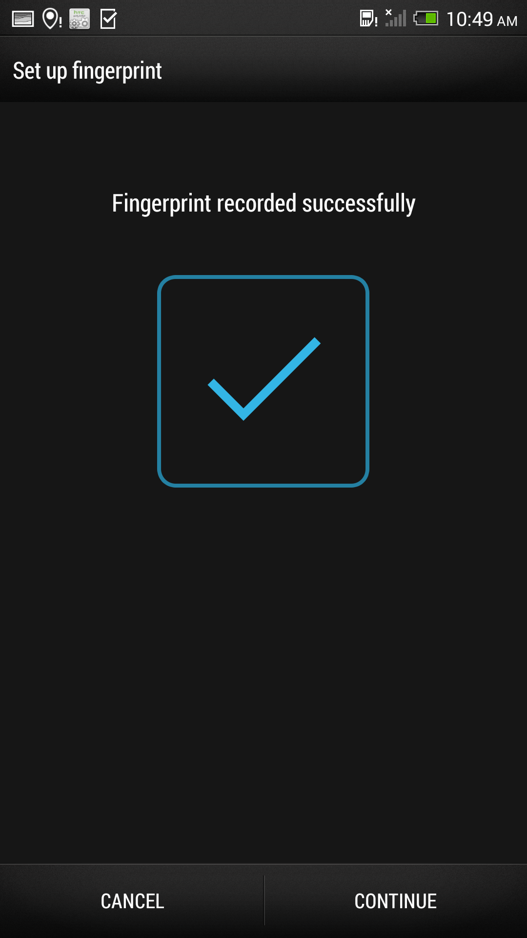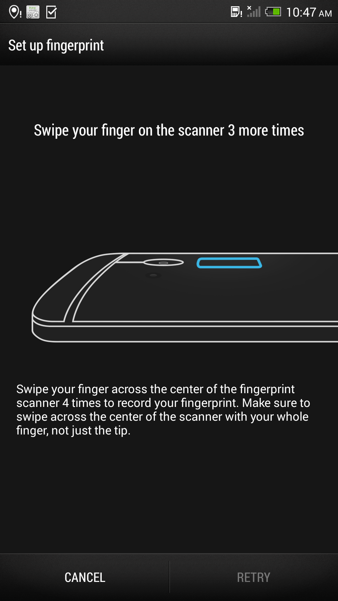 You can only register three fingers (Apple allows five), and the process for registration is different. You swipe several times on the HTC One Max, each time it tells you to go again, and again until it has a successful read – this should take just four swipes.