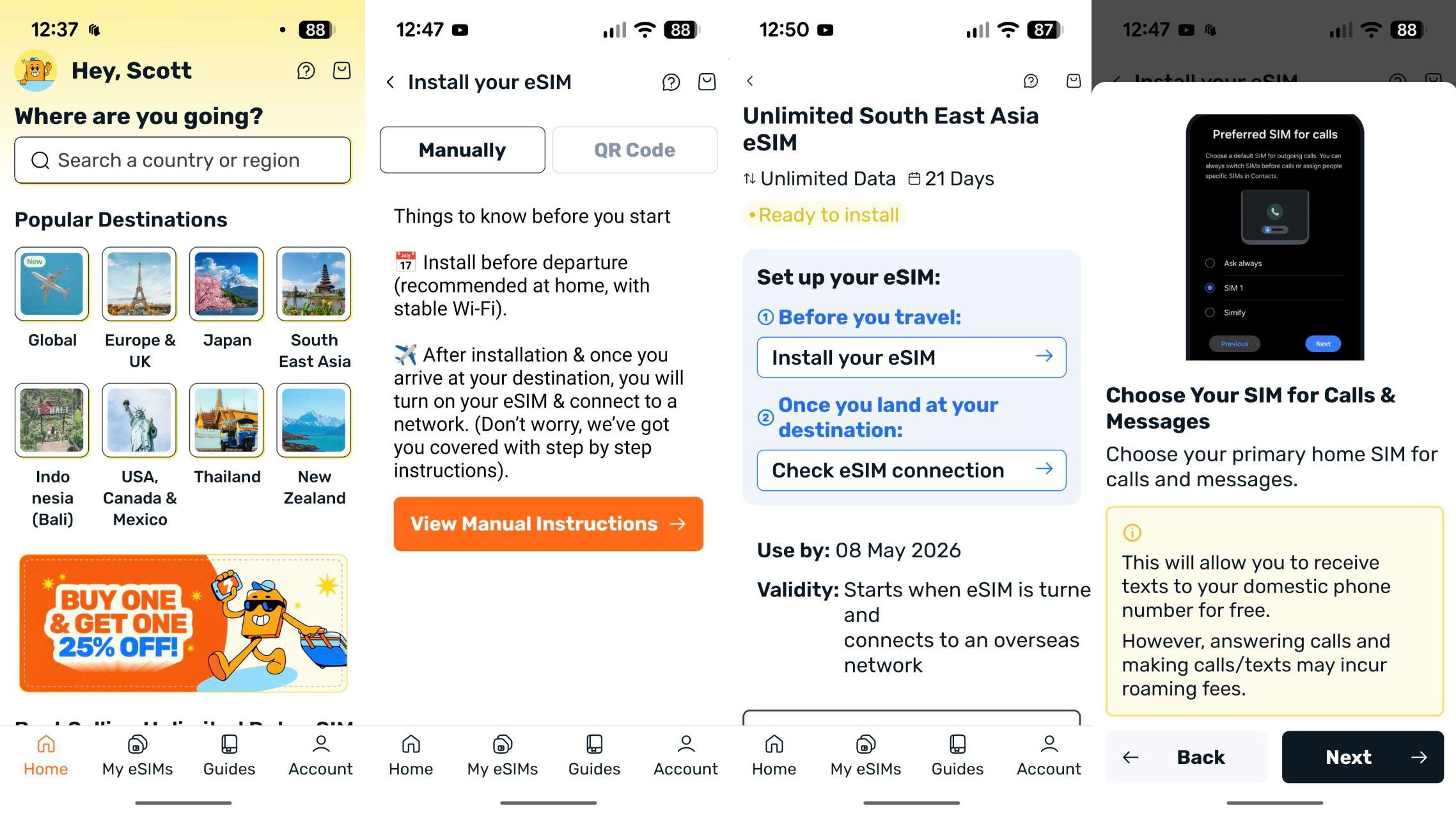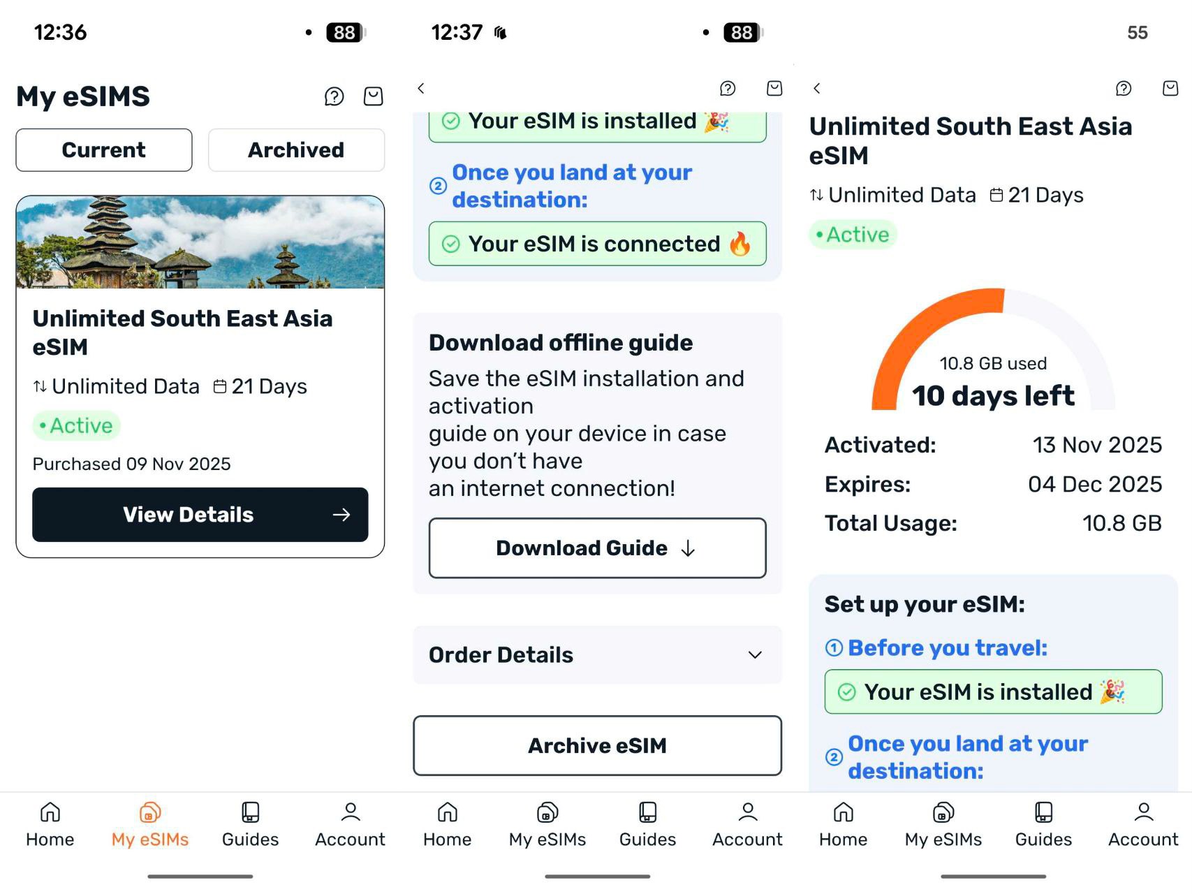 For example, I was travelling to Thailand via Singapore, so a Thai e-SIM would not cut it for Singapore, so I needed an e-SIM that would work in both countries. Luckily, Simify offers multi-country or regional e-SIMs as well as specific-country e-SIMs. For those travelling to several areas, there is even a Global e-SIM option, but it costs more than a standard regional plan.