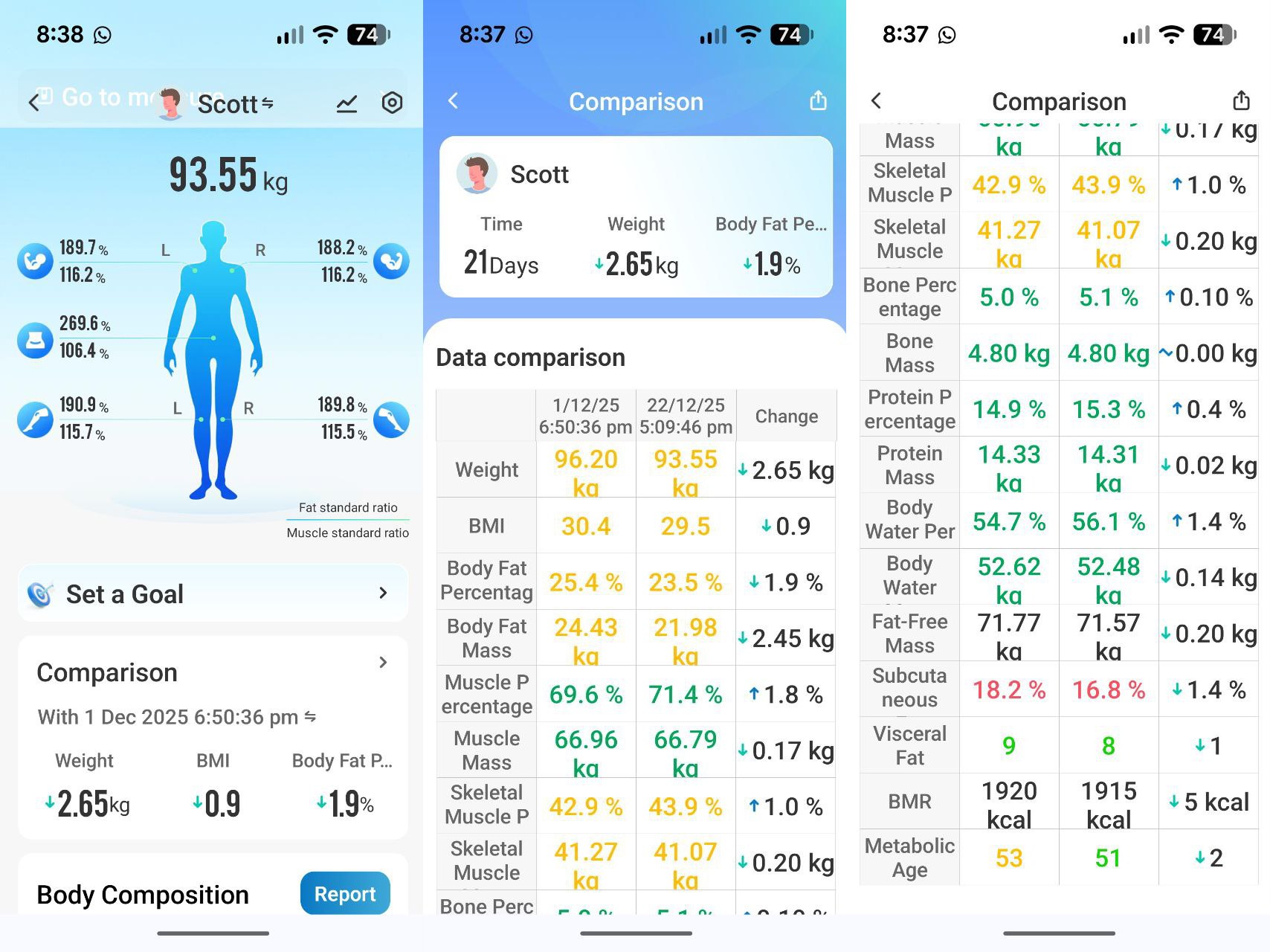 The app shows weight loss, BMI, body fat percentage, body fat mass, bone mass, body water, subcutaneous and visceral fat, amongst so many other things. In the past three weeks, my weight has dropped just under 3kg, body fat has decreased, muscle mass and percentage have increased, and my metabolic age has dropped from 53 to 51 (I’m 52). Progress, finally.