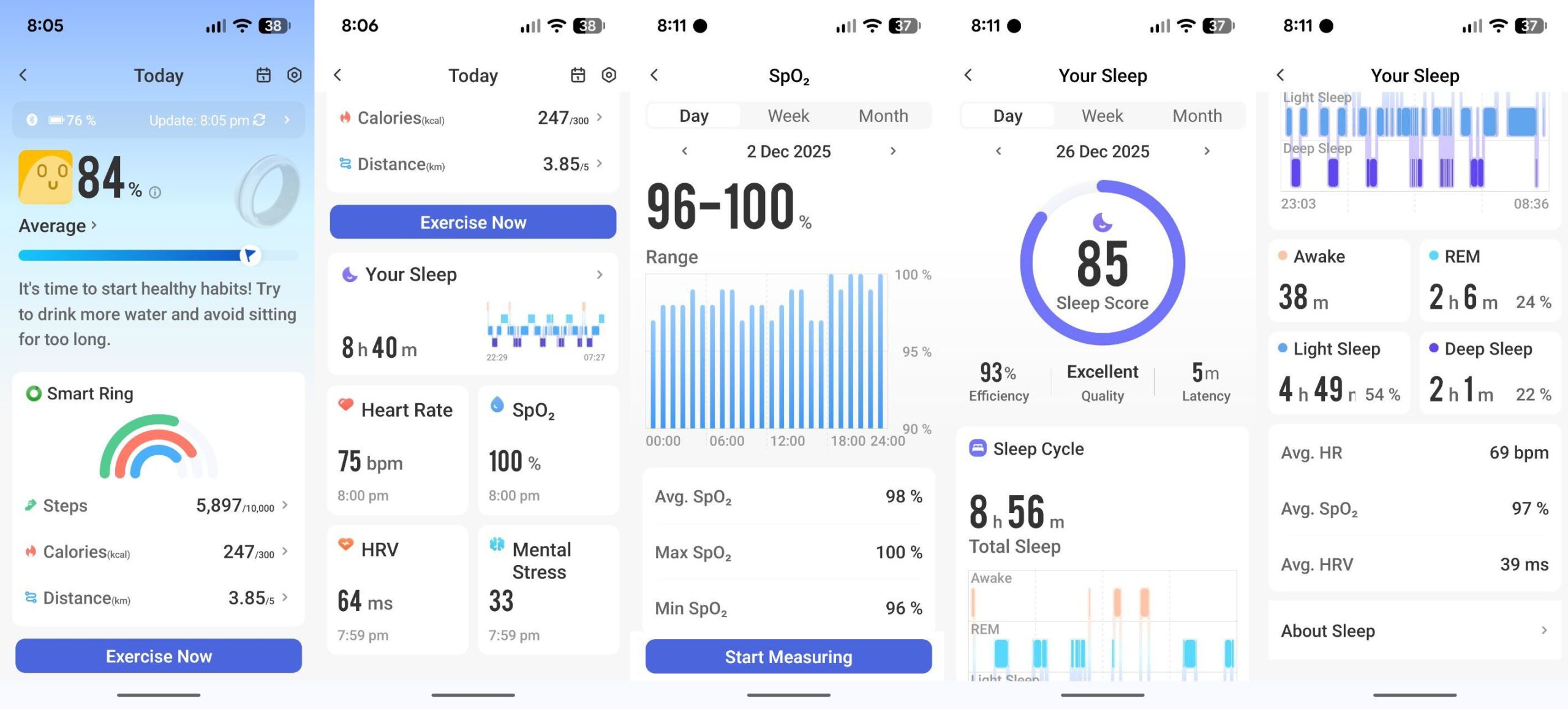 By itself, the app/ring will record your ‘Activity’, ‘Steps’, ‘Sleep’, heart rate, heart rate variability, SpO2, and mental stress: all the basics. The measurements are accurate when compared to those from my WHOOP MG, which is all you can really ask.