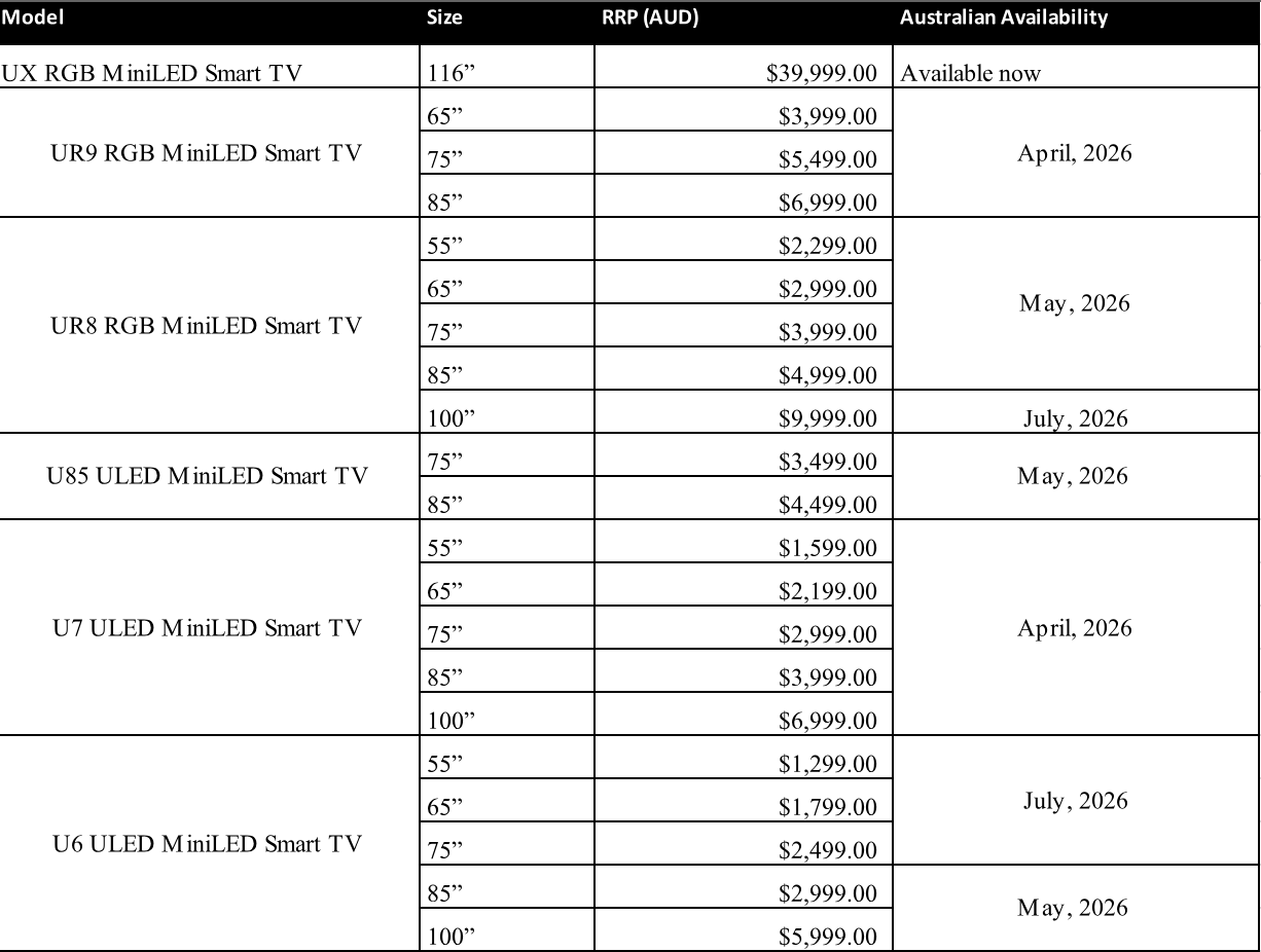 Hisense’s 2026 range will begin arriving at retailers from late April onward. Pricing can be seen below: